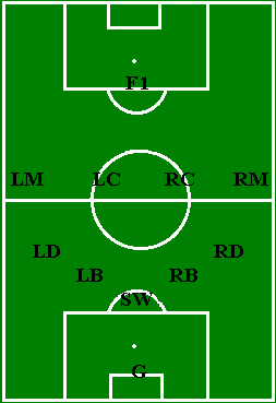 The 5-4-1 adds to a 4 men flat back a sweeper, which indicates that this line up is highly defensive. It is used as a starting line up for teams that are playing a team with a faster midfield than one's own. As in the 4-5-1, the forward (F1) will have to run tremendously, so that a substitution will be necessary.